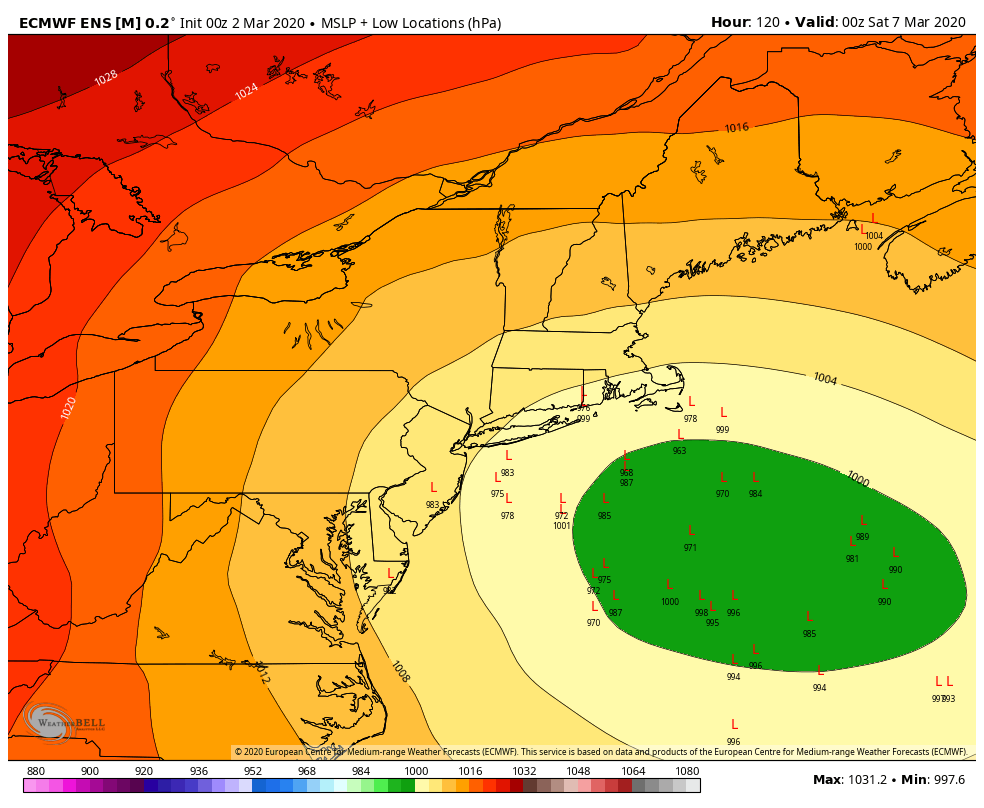At the moment, ensembles are in unusually strong agreement that a notable coastal storm will develop. The exact track of the system is uncertain, but the signal is strong for this range (3-5 days) with almost all ensemble members indicating a storm of some sort.