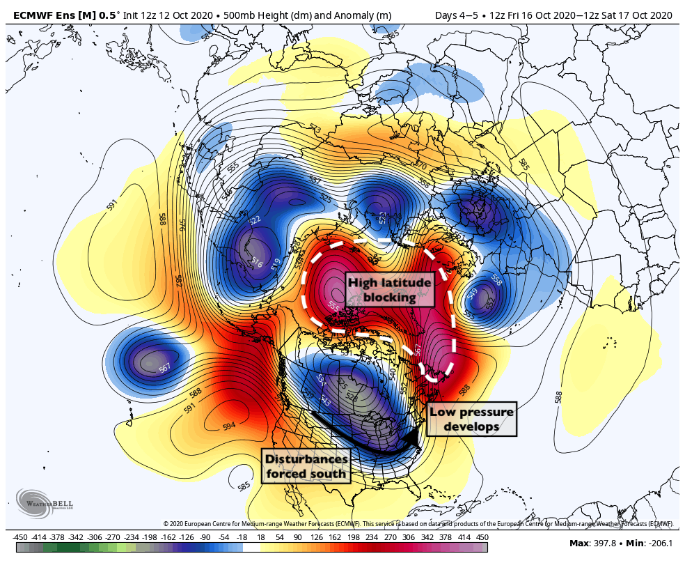 While we are enjoying pleasant conditions, trouble will be brewing in the Arctic. Forecast models are in good agreement that anomalous blocking will develop in the higher latitudes of the Arctic and Atlantic Oceans. These blocking ridges of high pressure can act to disrupt the flow of the atmosphere in those regions, which eventually has a ripple effect on our weather too.
