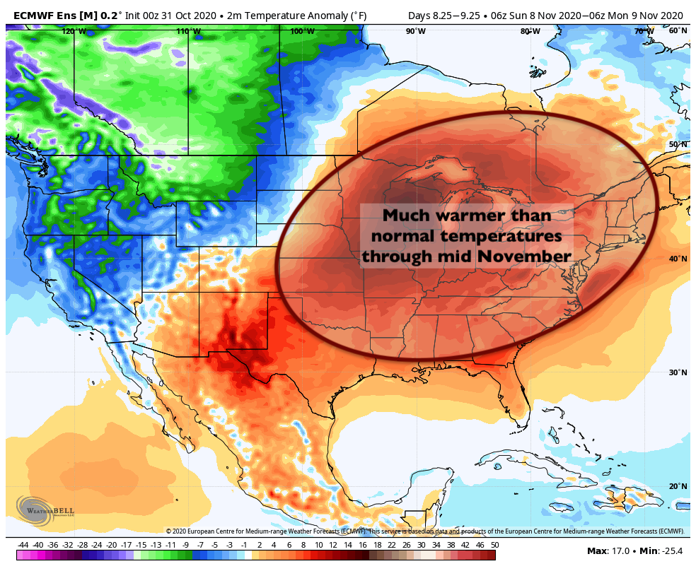 By Thursday and Friday, temperatures could reach 15 to 20 degrees above normal, with highs in the upper 60’s to near 70 degrees (!). This anomalous warmth looks likely to continue through the weekend and may even rebound into the week afterward, leading us towards the middle of the month of November in a very warm pattern.