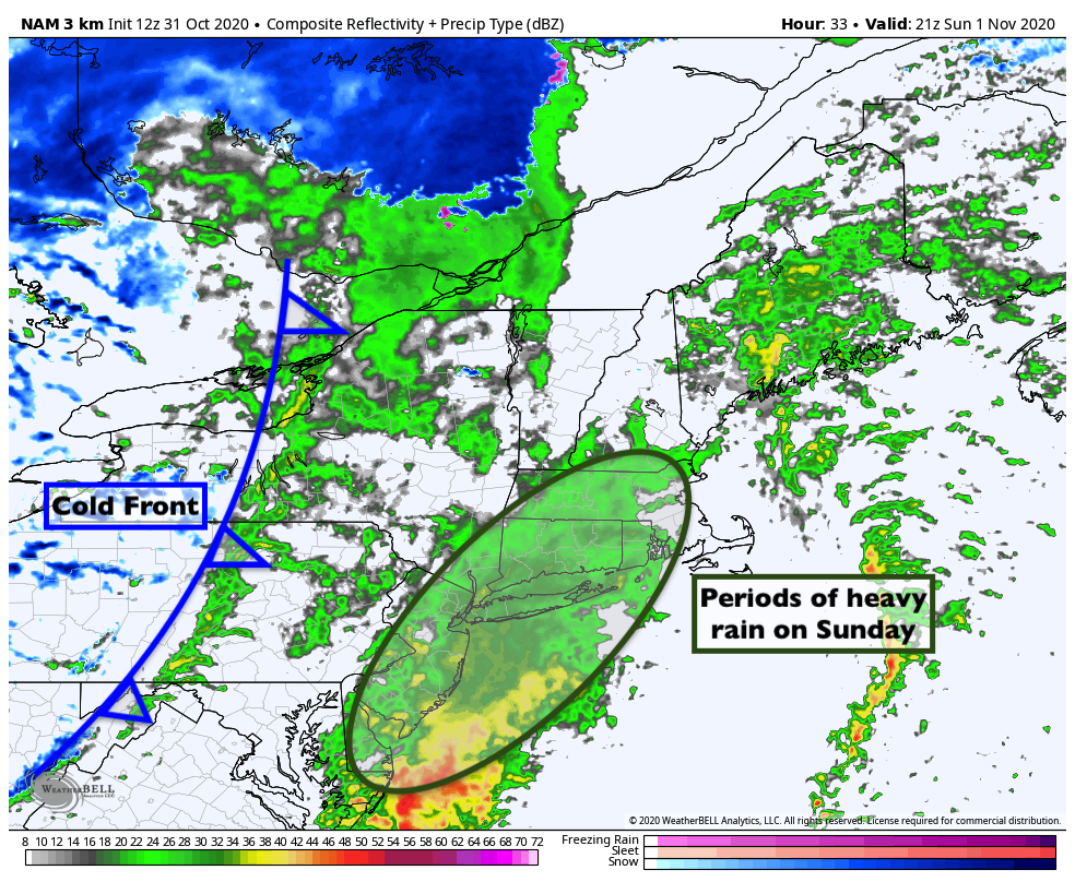 The sun will set in NYC at 5:53pm this evening, the last sunset after 5pm until late January of 2021. Daylight saving time ends tonight at 2am, and sunset on Sunday is at 4:51pm. Now that we’ve gotten that misery out of the way, let’s talk about the weather.