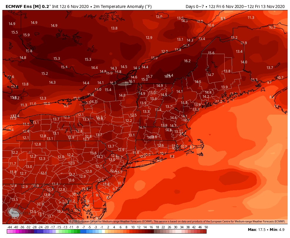 The longer range forecast features very little signal for the abatement of warmth. The long range ECMWF Ensemble suggests that warmer than normal temperatures could persist into the last week of November, and extended range guidance keeps temperatures near or above normal through around December 1st in NYC.