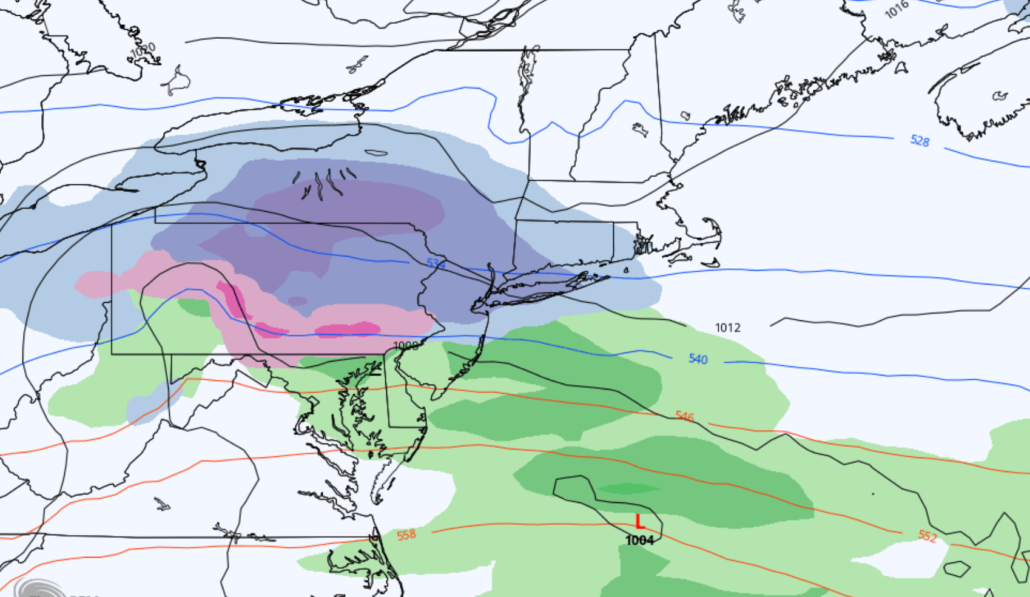 The ECMWF model (pictured above and left), for example, has recently trended lighter with precipitation totals. It suggests light and sporadic precipitation, with snowfall amounts generally near 2-3″ in the NYC Area. The GFS (above right), and some other guidance are a bit more bullish with precipitation totals and dynamics, leading to snowfall totals closer to 4-5″.