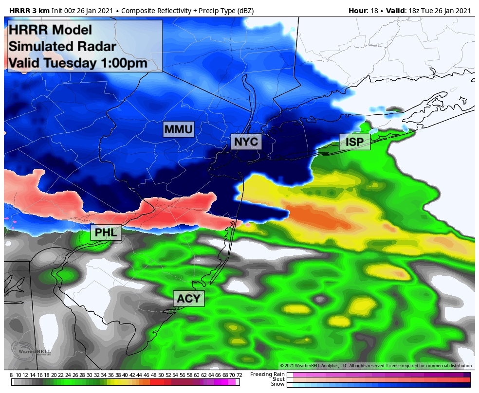 Snow is likely to begin throughout the area on Tuesday morning, spreading into New Jersey from southwest to northeast. Precipitation should be sporadic and mostly light in intensity through mid-morning. By late morning and early afternoon, the intensity of precipitation should breifly increase thanks to an uptick in atmospheric lift.