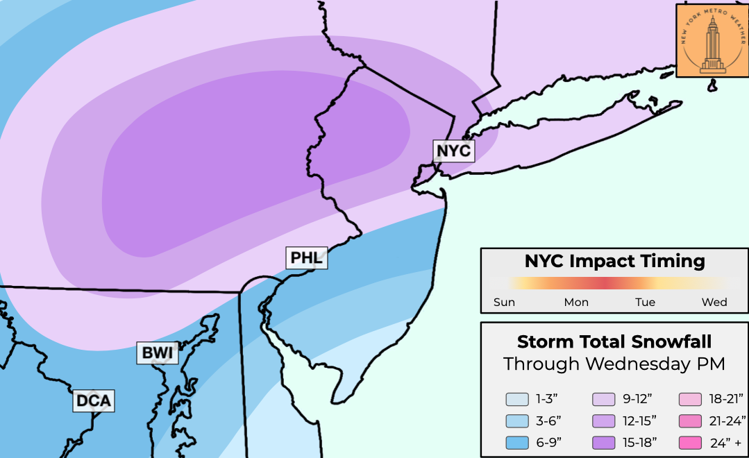 Our current forecast takes a blend between the major ensemble suites, with a slight lean towards the European model guidance. This leads to a high confidence forecast of 12-15″ in the NYC Metro area and higher amounts further west. We have laid out the anticipated timing of impacts below: