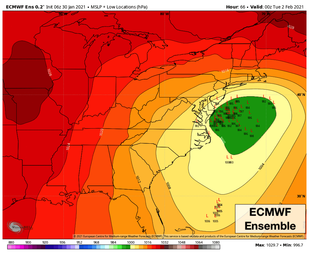 Forecast model guidance has come into much better agreement regarding the eventual track and intensity of the storm system. The GFS, Euro and Canadian ensembles all agree that a low pressure system will move northward off the Mid-Atlantic coast before redeveloping to the north and east, south of New England.