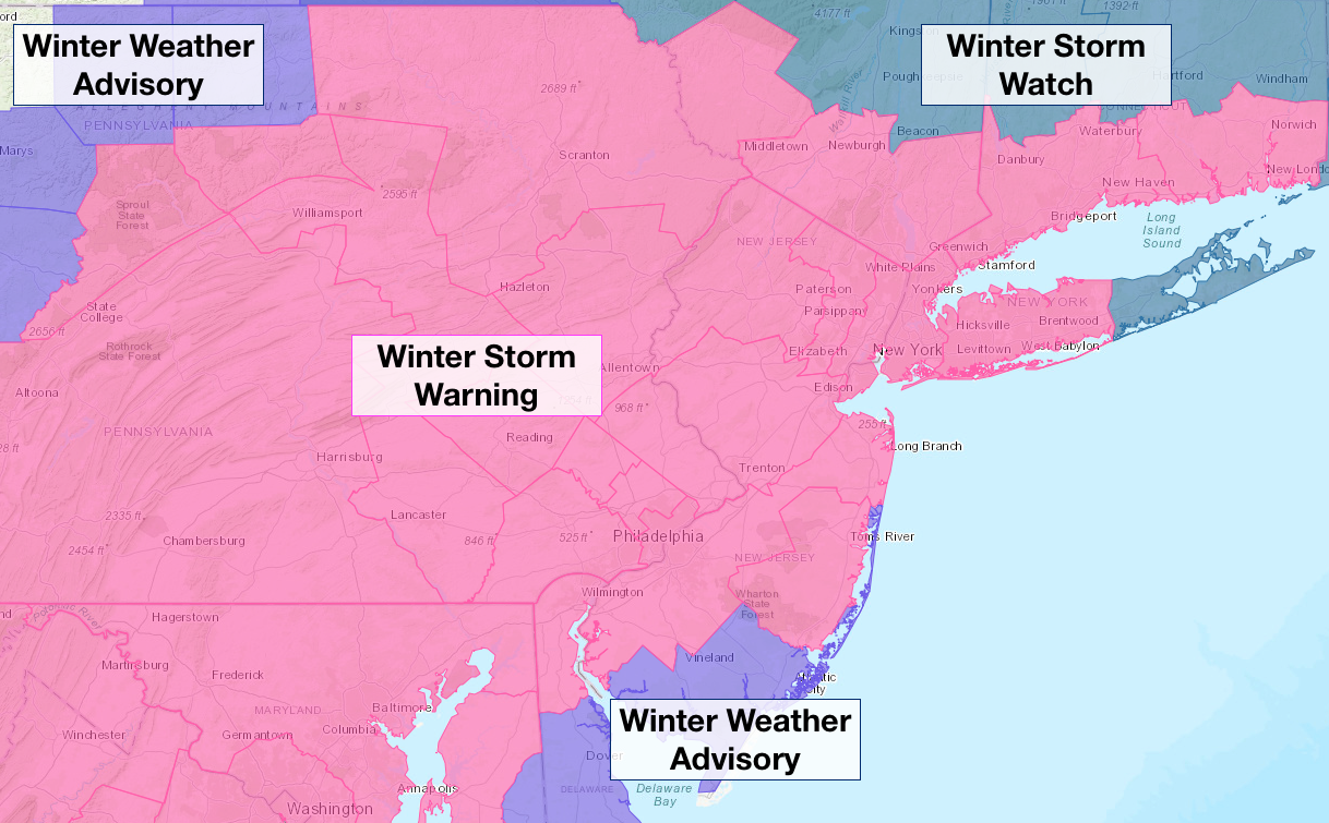A Winter Weather Advisory is in effect for parts of N PA and SE NJ, where snowfall is anticipated but impacts are expected to be less significant. The NWS may choose to upgrade parts of the area to a Blizzard Warning where winds will consistently reach 40mph and heavy snowfall is anticipated.