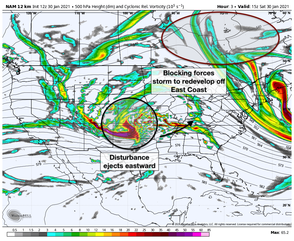 As this system moves eastward toward the Ohio Valley, it is forecast to amplify and strengthen. The storm will be forced underneath a high latitude block, or -NAO, which is present over Southeast Canada. These blocks are notorious for slowing down “traffic” in the atmosphere and resulting in impactful winter weather events in the Northeast states. The high latitude block also ensures that there will be plenty of cold air in place as the storm approaches This same low pressure system will be forced to redevelop offshore by the aforementioned block, with a new low pressure center developing off the Mid-Atlantic coast. This will allow snow to spread into the Mid-Atlantic and New England on Monday.