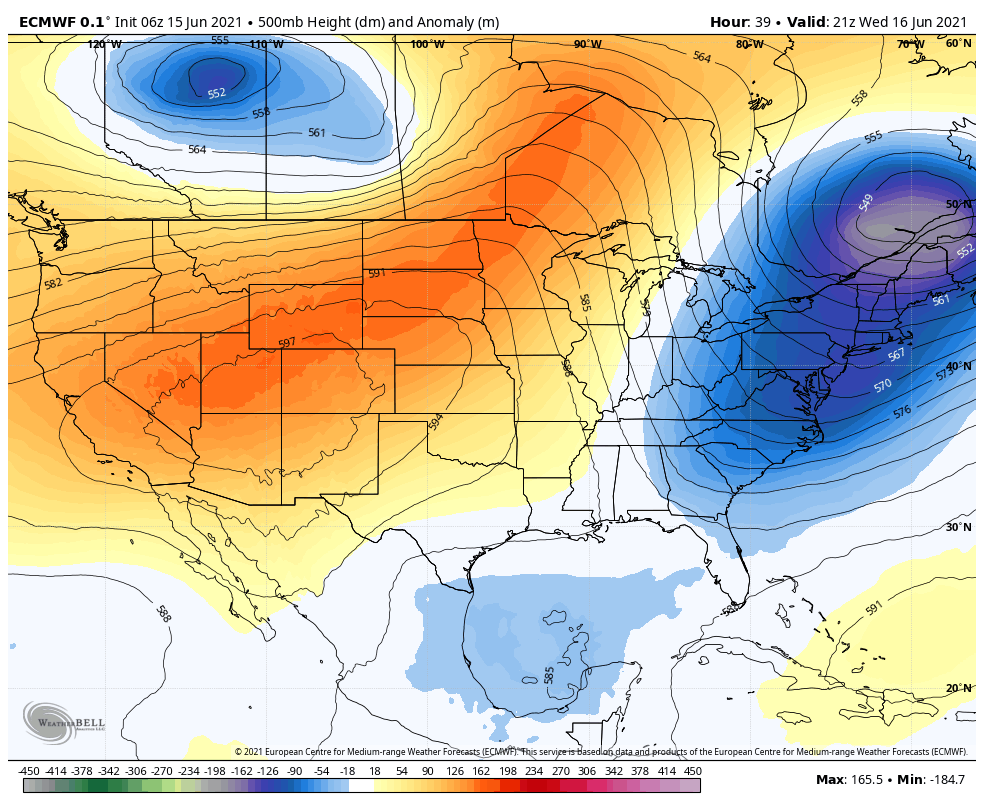 Troughing (below normal heights in blue) will keep temperatures below normal in the area for the next few days.