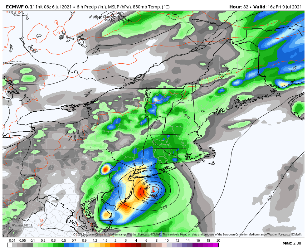 The ECMWF model showing the remnants of Tropical Storm Elsa bringing heavy rainfall to parts of the region by Friday.