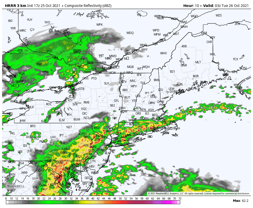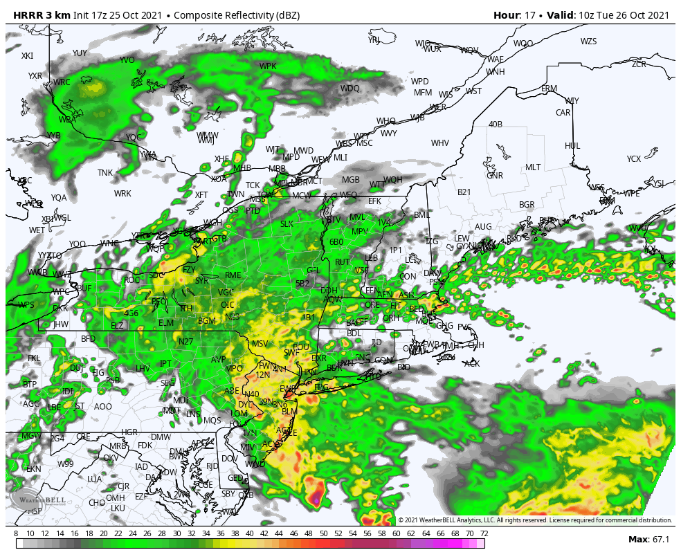 During this window, the coastal low pressure will have consolidated well to our east, removing any heavy rain threat. But periodic rain showers will continue to get pulled from that system into much of our area. Rainfall rates will generally be light, with occasional moderate bursts. As time goes on, rainfall coverage will gradually decrease, with much of the overnight hours being mainly dry. We should be completely dry by Wednesday morning.