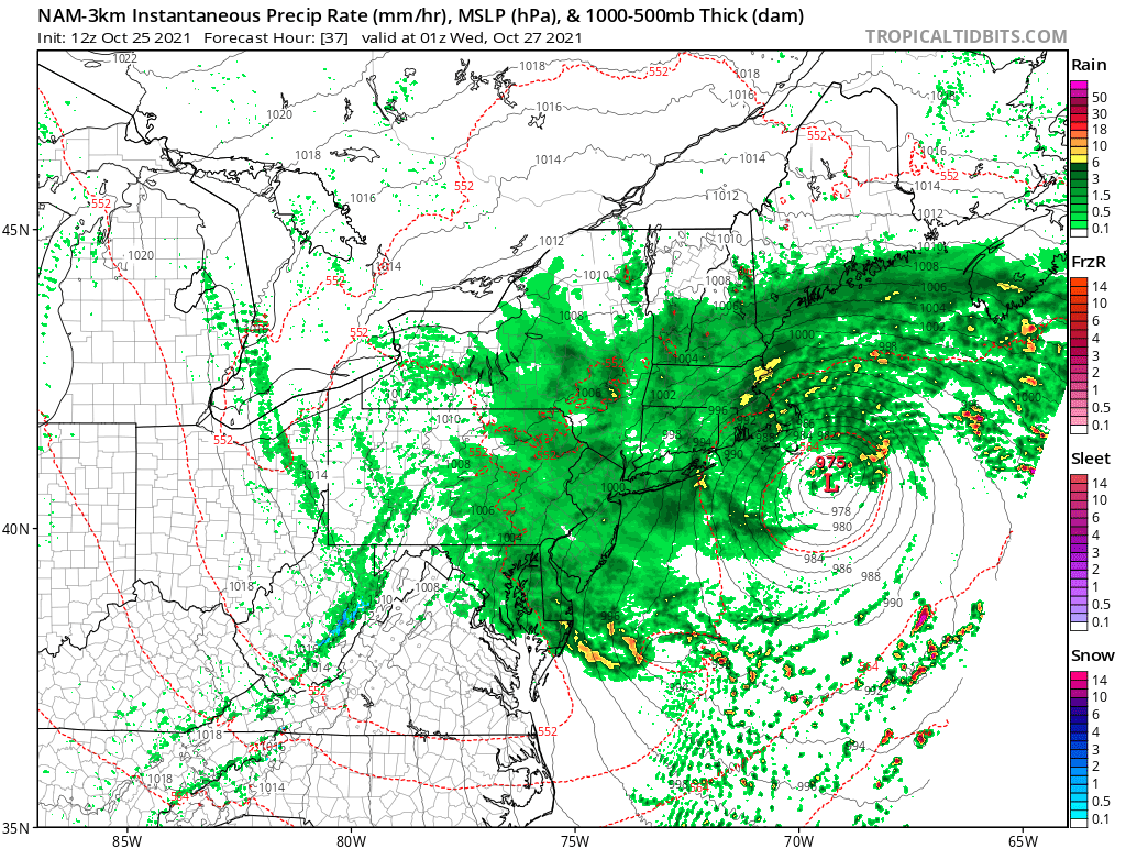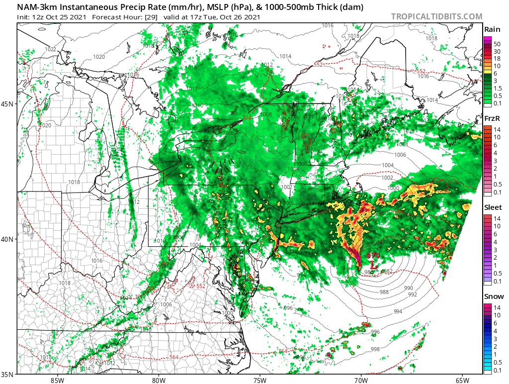 But once the coastal low pressure truly takes over, it is possible that precipitation consolidates towards that low pressure center, away from our area. Furthermore, the warm front responsible for “fuel” and moisture during the overnight will weaken as the day goes on. This means that at some point during the day on Tuesday, rainfall rates will become lighter and more sporadic across much of the area, while heaviest rain shifts towards Southeast New England. Exactly when that occurs will determine how much rain we see on Tuesday.