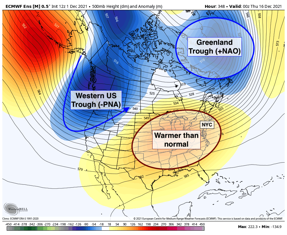 What does this mean for us in terms of sensible weather? Quite simply, expect temperatures to gradually warm as we move towards mid December. Notably, winter weather threats should be off the table in the NYC Metro for the foreseeable future. There are some hints that a colder and active pattern could return by late December, but confidence is quite low in any sensible impacts on a forecast more than three weeks in advance.