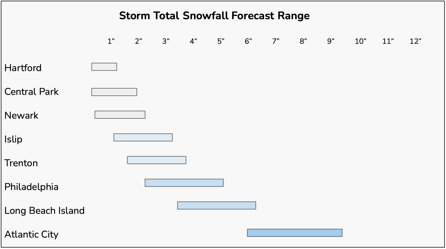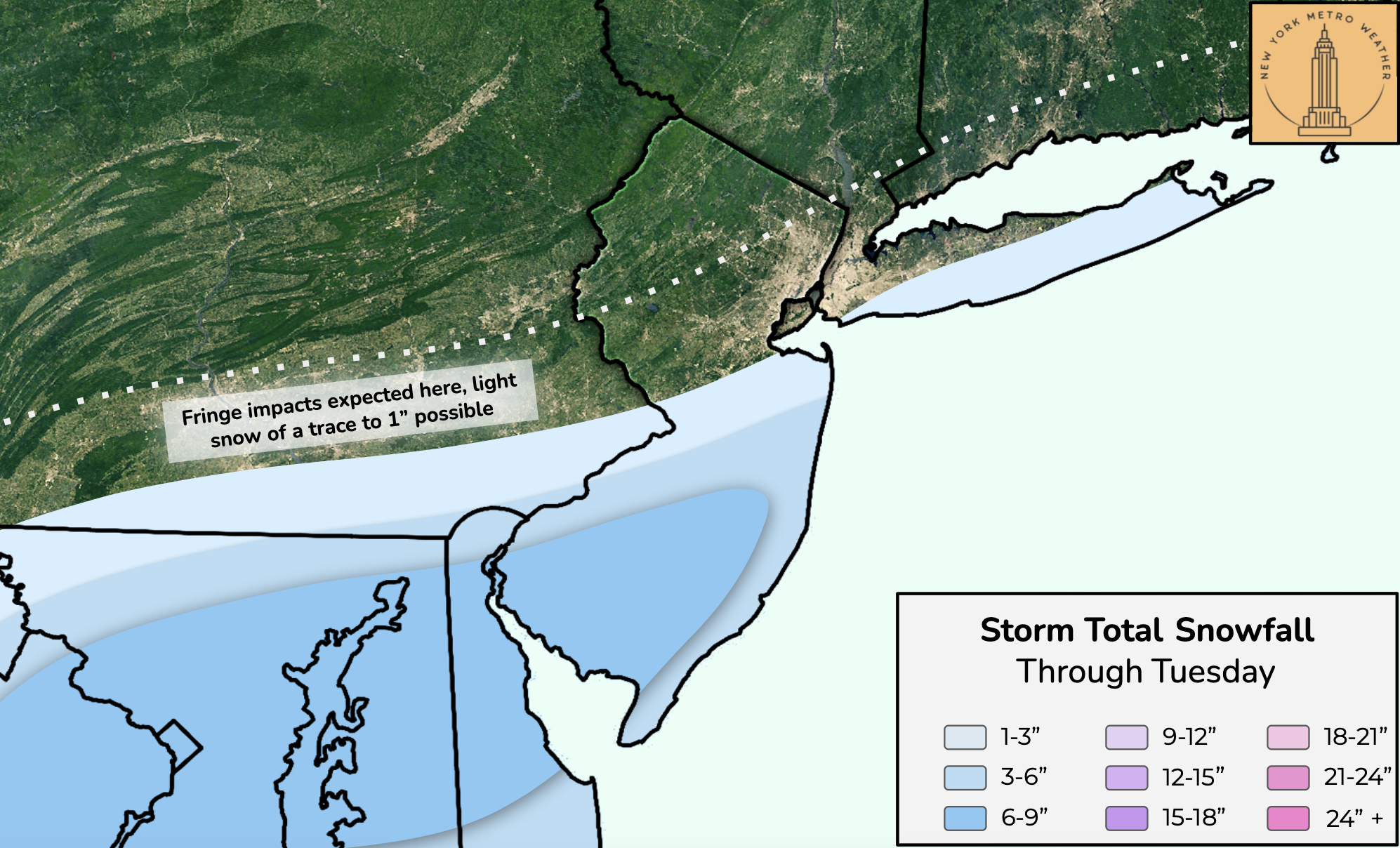 Utilizing our knowledge of how these events typically transpire, plus weighing the model trends and similar events of the past, we can at least begin to formulate a forecast that we are comfortable with. At the moment, that includes only a fringe impact event in the NYC Metro, with perhaps a trace to an inch of snow. A snowfall of 1 to 3 inches appears more likely to the south the Driscoll Bridge in New Jersey. 3 to 6 inches of snow is possible to the south of the Philadelphia metro, and locally 6 to 9 inches of snow is possible in parts of Southern New Jersey.