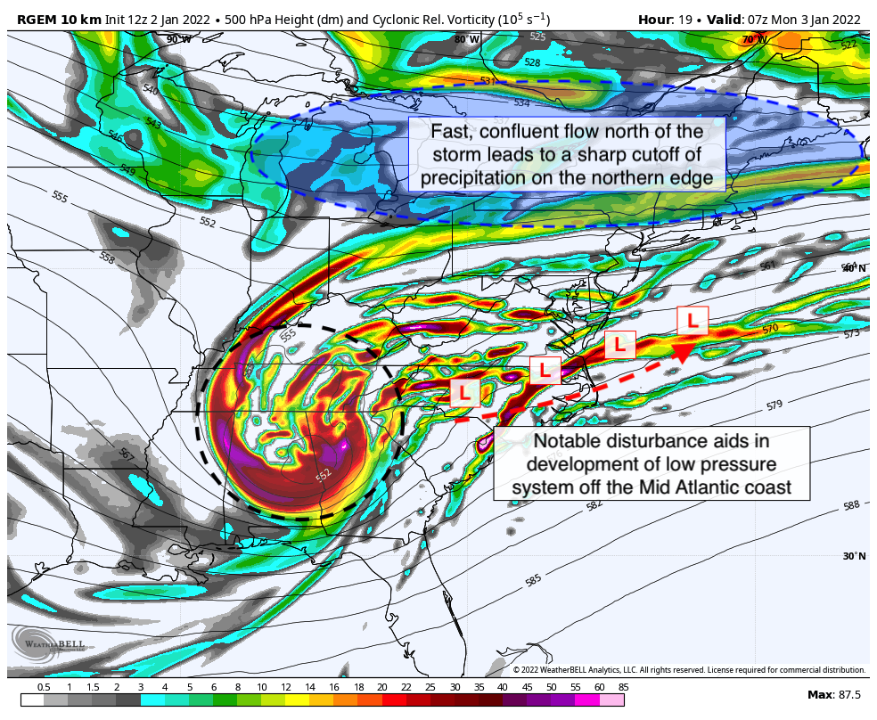The amplified trend with the disturbance has also led to a more impressive jet streak in the mid and upper levels of the atmosphere. This results in enhanced lift, and forecast models have expanded the precipitation shield with the system accordingly. As a result, a substantial winter storm appears likely in the Mid Atlantic states.