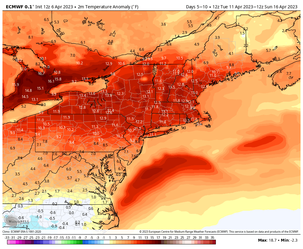 ECMWF ensemble data suggests that temperatures will average 8-10° F above normal in the NYC Metro and surrounding areas for the 5 days ending next Saturday. This is impressive for such a long time scale. That same ensemble also suggests a mean of 0.0″ precipitation for the same time scale. It doesn’t get much better than that.