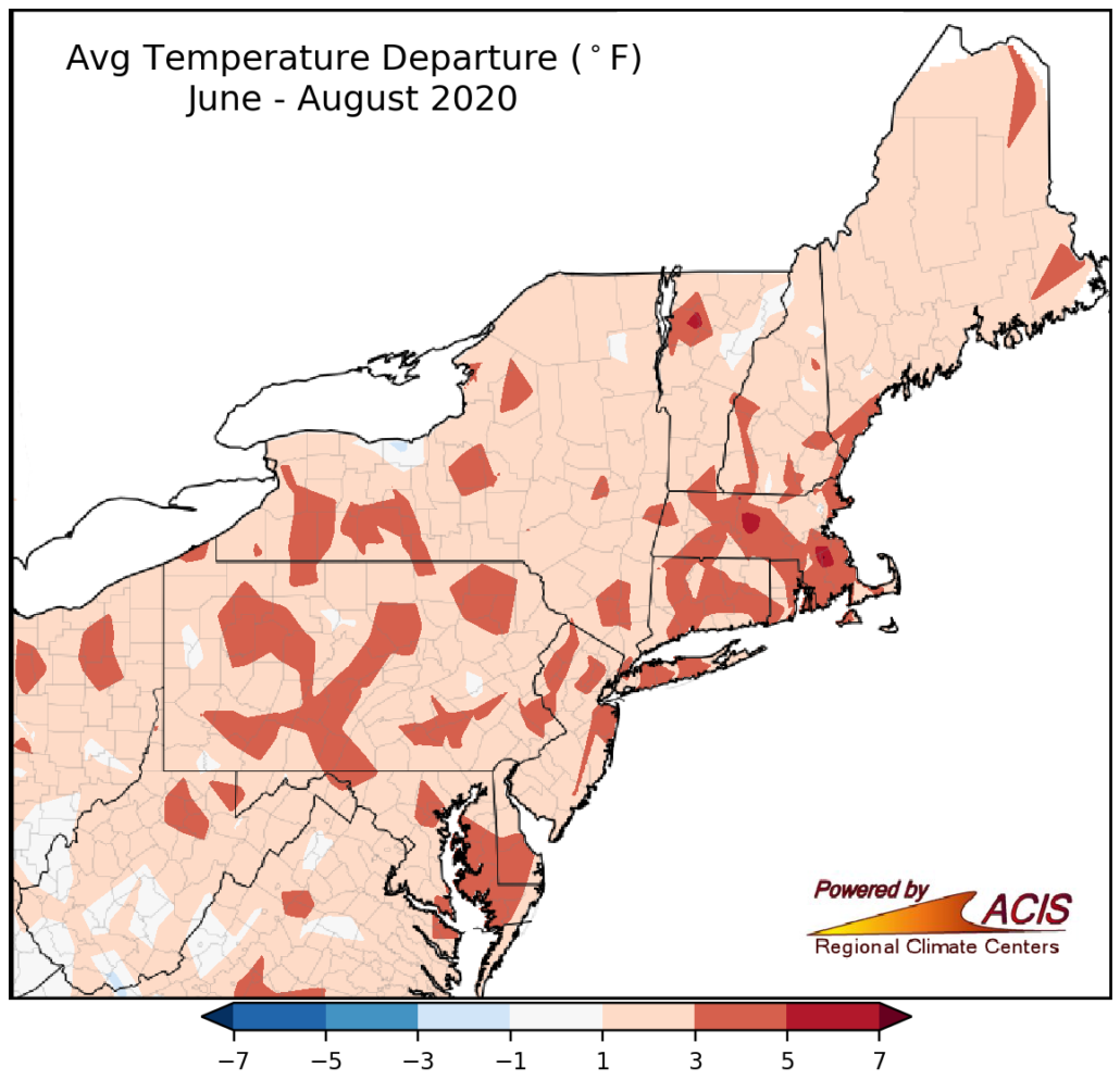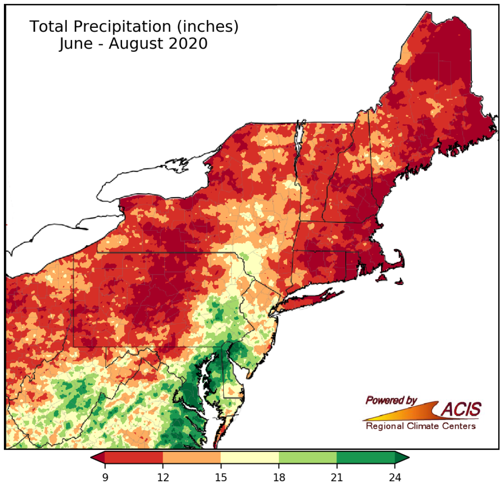 The summer of 2020 was warm and relatively dry throughout New England. Precipitation numbers have crept upwards over the past few weeks, but 3-month departures are still solidly below normal. Drier weather can lead to faster changing and somewhat less vibrant autumn colors.
