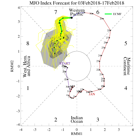 Forecast models suggest that a burst of anomalously warm air will push into the stratosphere during the middle of the month of February. This may occur concurrently with the very impressive, near record-breaking MJO pulse in Phase 7. Research has suggested (Wheeler/Hendon et al, 2004) that MJO bursts into Phase 7 with impressive amplitude can be predecessors to SSW events. Warmer anomalies in the lower polar stratosphere have been shown to suddenly and rapidly develop – mainly as a result of constructive interference between mid latitude circulations and a anomalous convection in the tropical Pacific Ocean.