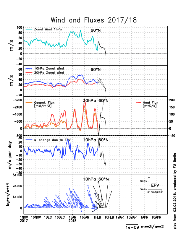 The latest European Model analysis shows a strong increase in heat flux (third panel) in a very poleward manner (bottom panel), which ultimately helps to significantly weaken the Stratopsheric Polar Vortex, evidenced a large drop in zonal winds (fourth panel). (FU Berlin)