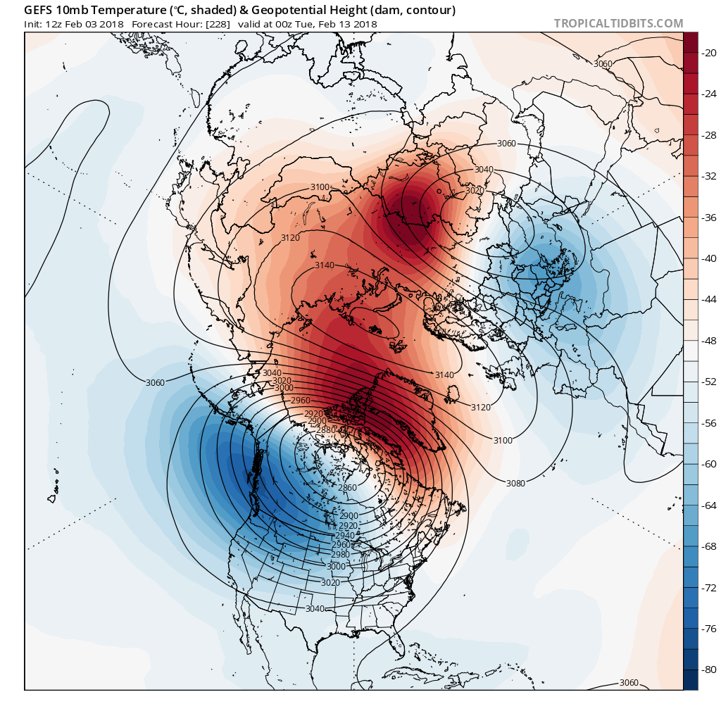 Today’s GFS ensemble mean valid on February 12th shows a significant warming in the Stratosphere, allowing the Stratospheric Polar Vortex to split into two pieces (Tropical Tidbits).