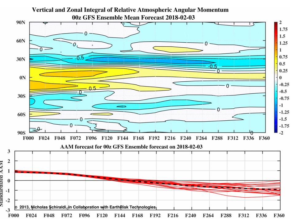 We see further evidence of this by the fact that the latest forecasts are showing a significant decrease in Atmospheric Angular Momentum (AAM) in the Arctic. Mean atmospheric flow trends to run from west to east, and pretty fast in the Arctic — especially within the polar vortex, so a +AAM is faster than average west to east flow.