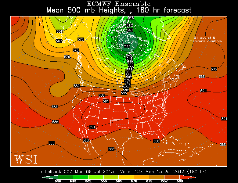 European Ensemble Mean data shows a strong heat dome building into the Midwest, along with the strong Western Atlantic Ridge building back in. This should help to create another heatwave for next week. Image courtesy of the WSI Model Lab.