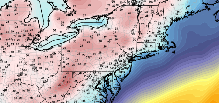 The European Operational Model shows a storm system north of the Great Lakes, combining with the Western Atlantic Ridge to usher in quite warm and humid conditions for Wednesday, with the chance of afternoon thunderstorms. The best threat, as of now, will be north and west of NYC. Image courtesy of the WSI Model Lab.