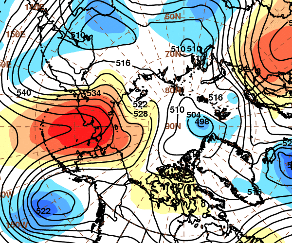 GFS height anomalies at 500mb (mid levels of the atmosphere) showing the anomalous ridge over the Aleutians and Northwest Alaska.