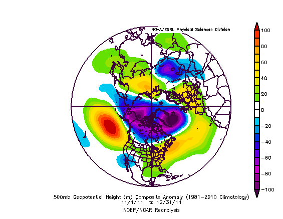 An anomaly composite from last November and December shows a lack of any high latitude blocking and ridging, which kept the cold air bottled up in the Arctic. This resulted in a very warm pattern for the Continental US.