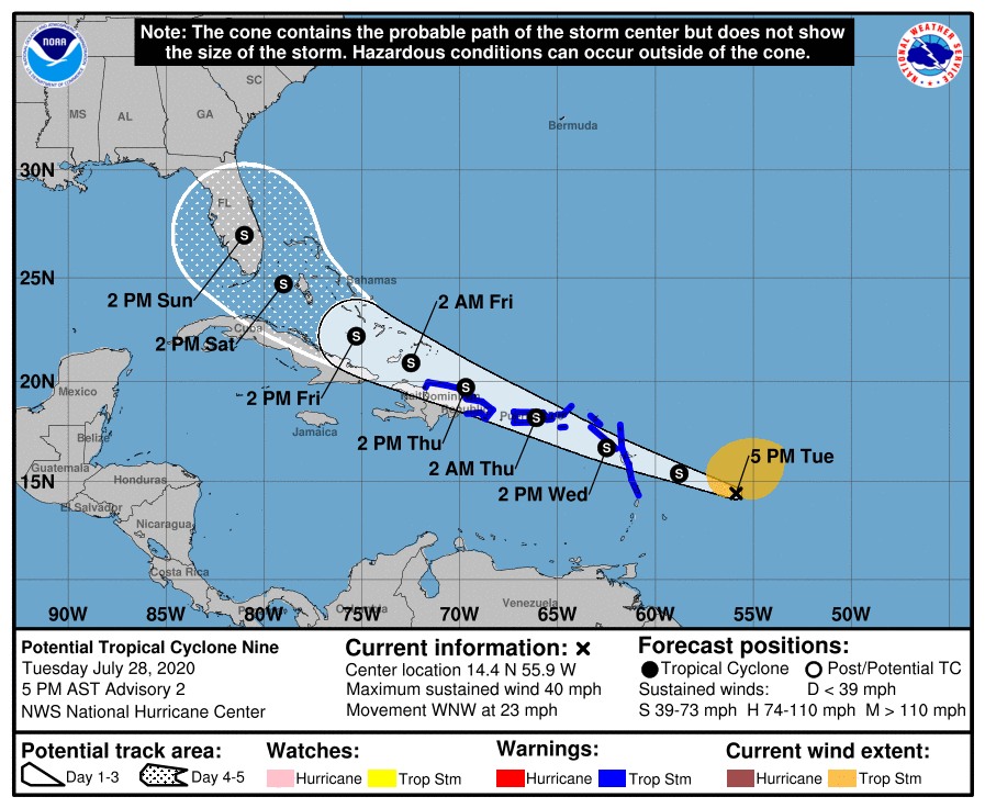 Potential Tropical Cyclone (PTC) Nine formed earlier today, designated by the National Hurricane Center. This system will move generally westwards over the next few days, on a path towards the Caribbean, while strengthening gradually. The system is forecast to strengthen into a Tropical Storm over the next 24-48 hours. If it does reach tropical storm strength, it will be named Isaias.