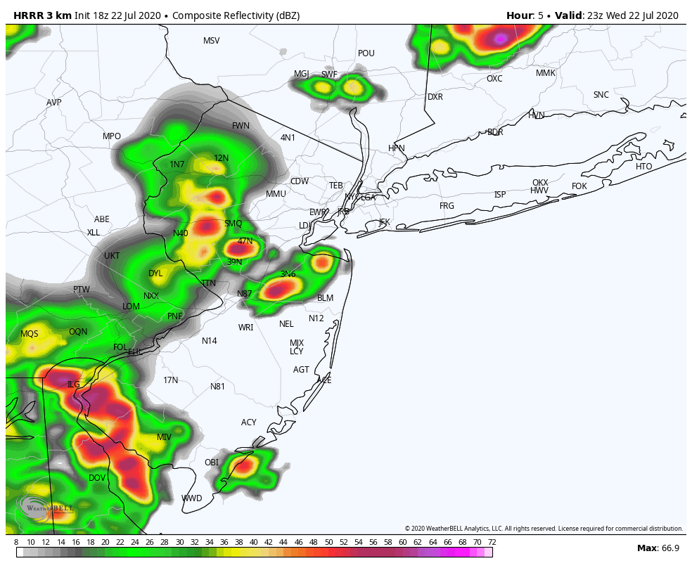 A few showers and storms are moving through the region this evening, and will clear the NYC Area by early evening. Additional storms should develop across Southern and Central NJ later tonight, before the frontal boundary clears the coast. Expect improving conditions everywhere by morning. Partly cloudy and warm conditions will continue on Wednesday, with highs in the lower 90’s.