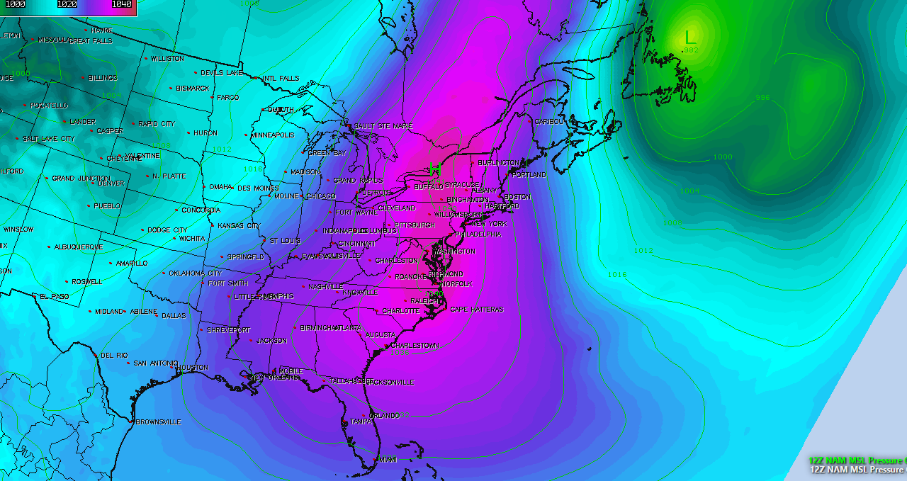 NAM model showing a large area of low pressure directly over our area by Sunday afternoon, providing calm and cold conditions