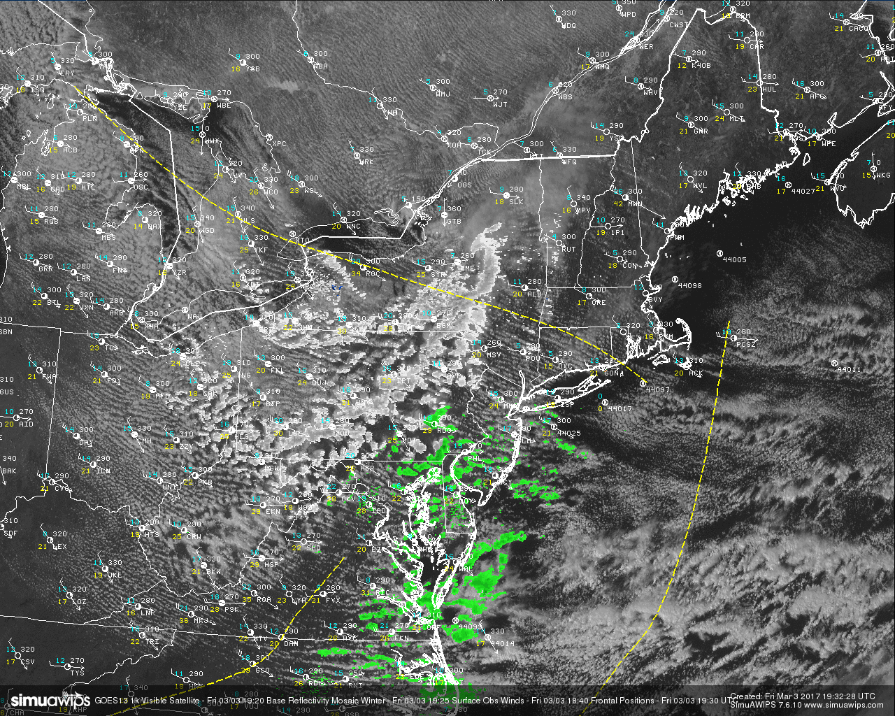 Current visible satellite imagery along with radar and surface observations showing numerous heavy snow squalls over PA (Courtesy of Simuawips.com)