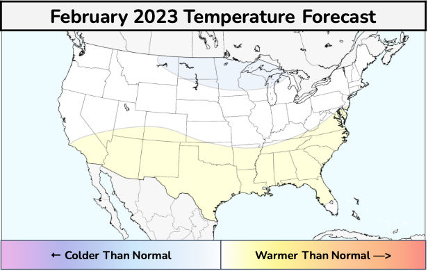 The forecast in February is highly uncertain and will depend greatly on the evolution of ENSO conditions across the Tropical Pacific during the winter months. This is an exceptionally low-confidence forecast, even compared to usual. Still, the expectation is that warmer than normal temperatures will begin to expand again in the Southern Plains including the Southeast States with the return of some Southeast US ridging. Cold risks are highly uncertain at this time especially their placement, breadth and intensity and limited colder than normal regions were included in the map as a result.