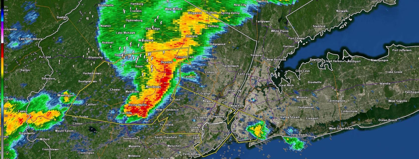By the early to mid evening hours, the very same storm complex was now pushing through New Jersey. Wind damage reports became more frequent, and as the storm moved through the NYC Metro Area it produced 58mph wind gusts in Tribeca and the Financial District.