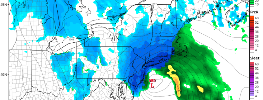Evolution of the weak coastal storm as well as the convective snows tomorrow on the latest RPM model (courtesy of WSI)