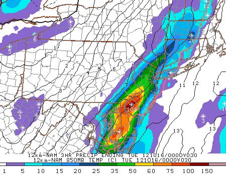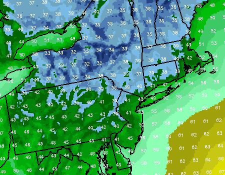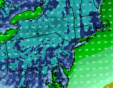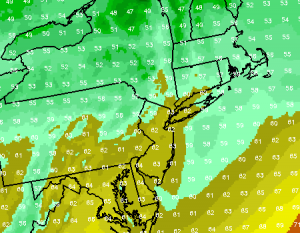 NAM forecast model showing tonight’s forecast low temperatures with the coolest readings in the interior/north and west of NYC Metro.