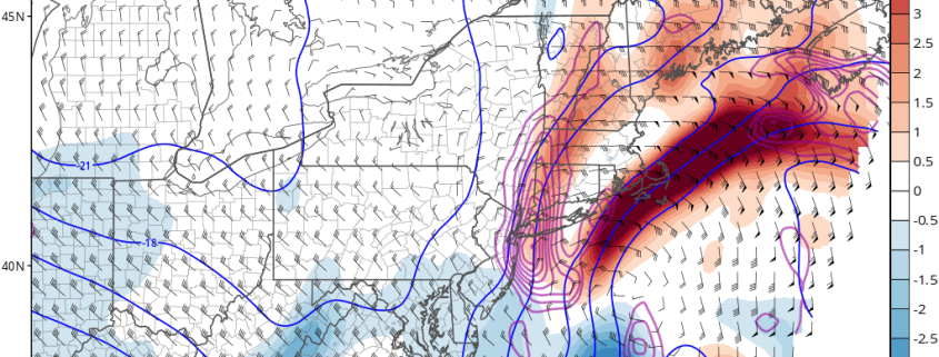 Today has been a relatively cool and calm day across the Northeast as the large area of low pressure that produced very heavy snowfall over a good chunk of the Northeast continues to pull away. Despite this surface low pulling away, a large upper level low over Canada continues to shift to the south and east, bringing in some weak mid to upper level energy. This weak energy over the region has produced some isolated snow showers and mostly cloudy conditions this afternoon, with some more impressive snow squalls located over the northern portions of New York and New England. As the day winds down, these snow showers and squalls should gradually die down, but a quick coating to an inch of snow cannot be ruled out over the aforementioned locations. Back towards the New York city area, westerly winds and cloudy conditions continue to persists with some very light snow showers present over southern New York and Northeast PA. Due to the large surface low pressure to our northeast, northwesterly/westerly winds have been prominent over the region. In addition to these surface winds from Canada, we also have a relatively fresh airmass coming in from southern Canada that has allowed for a relativity cool day across the Northeast. Highs were only able to make it into the upper 30’s to lower 40’s, with occasionally gusty winds making conditions feel a bit colder than they actually are. Winds will also gradually die down as the pressure gradient over the region continues to weaken. Low to mid-level clouds over the area should persist as the upper level low over New England continues to meander, so expect lows to range from the middle 20’s to lower 30’s across much of the Northeast tonight.