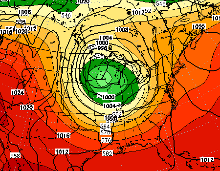 ECMWF forecast model showing the strong cutoff low at 500mb (mid levels of the atmosphere). Notice the upper level low is “cut off” from the main atmospheric flow.