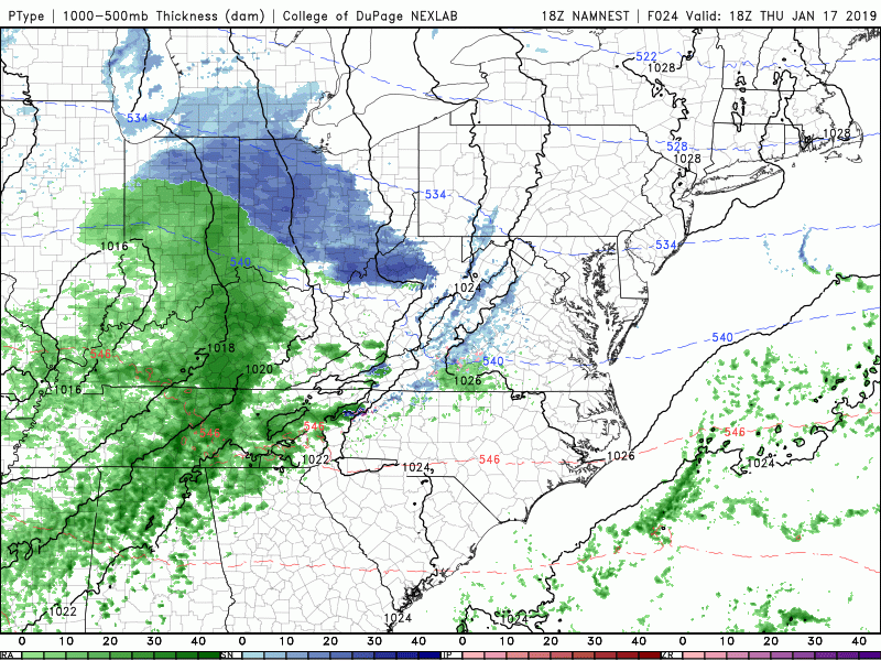 High resolution NAM simulated reflectivity showing the evolution of the light snow event tomorrow night and into Friday morning