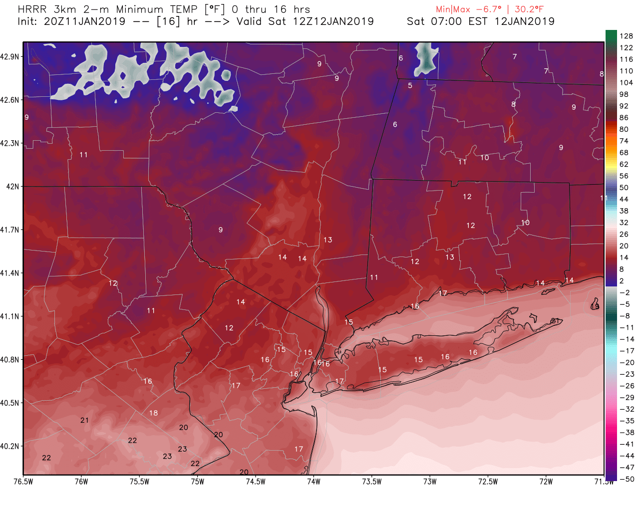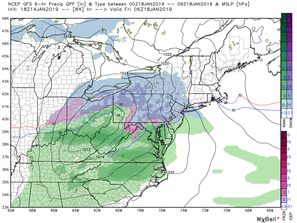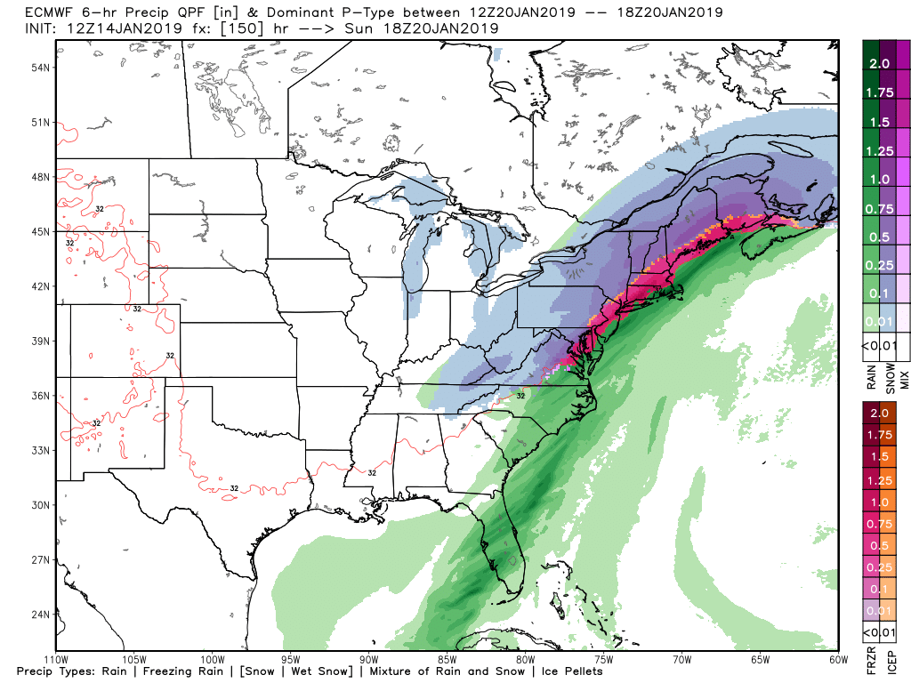 - The system over Canada DOES NOT interact with the southern stream system and misses the phase. This would allow for the surface low to move to the south and east of our area, bringing in much colder temperatures into the Northeast. A thump of moderate to heavy snow would be likely for most of the Northeast late Saturday night and into Sunday morning. Snow would potentially change to sleet and freezing rain from south to north during the day on Sunday as warmer air in the mid levels of the atmosphere moves over temperatures that are still below-freezing at the surface. This would create a potentially hazardous situation for the immediate NYC area, with a thick layer of ice on top of snow. In this scenario, locations to the north and west would have a good shot at staying mostly snow as cold air from the north rushes into the area. This solution would obviously have a much higher impact for all locations outside of the immediate coast.