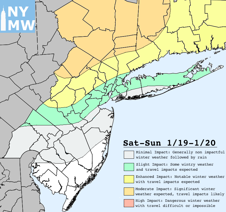 - The system over Canada DOES interact and phases with the shortwave to its south late Saturday and into Sunday morning. This causes the surface low to gradually strengthen and track from the Southeast and eventually moves to the west of our area. While an initial thump of moderate to heavy snow would be possible for locations to the north and west of NYC, precipitation would then quickly flip to rain for the remainder of this storm. This solution would have a rather limited impact for our area, with heavy rains likely during the day on Sunday.