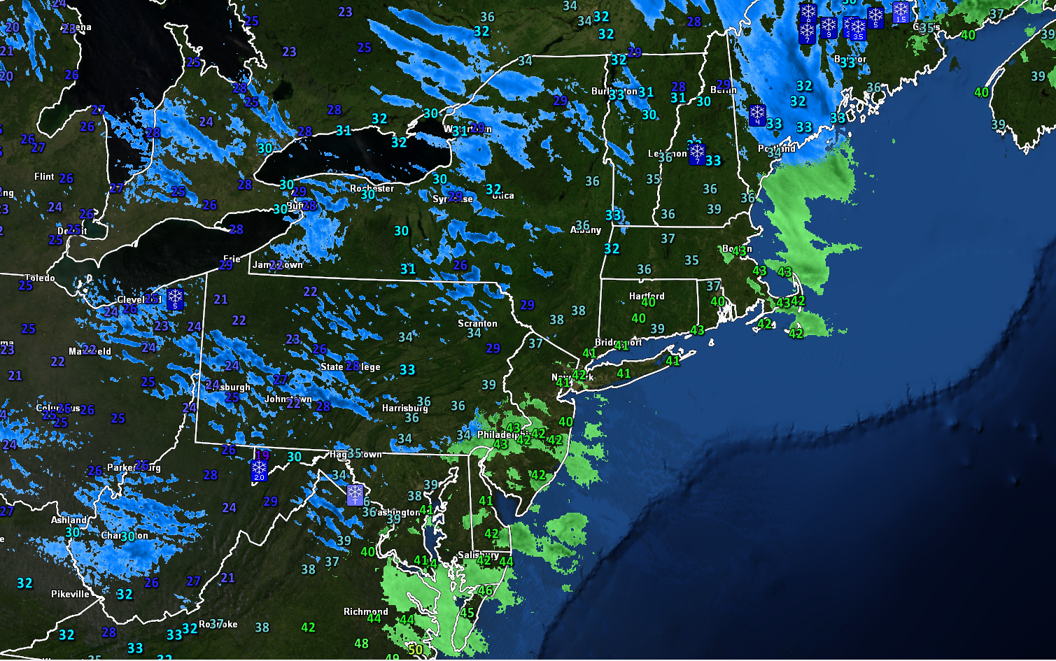 Today has been another calm and relatively cool day across much of the Northeast as high pressure remains in control of our sensible weather. Partly cloudy skies and mid-level flow coming out of the west allowed for temperatures to rise into the upper 30’s to lower 40’s for much of the NYC metro area, which is slightly above-normal for this time of year. A weak cold front is currently situated over portions of New York and Pennsylvania and has been gradually moving to the southeast during the course of the day. This cold front is expected to arrive later this evening, which will usher in a fresh batch of cold air into the region. There really isn’t much in the way of moisture associated with this front, so this will likely be another dry and cold night. Occasionally breezy conditions will set up behind the front with clearing skies from northwest to southeast tonight.
