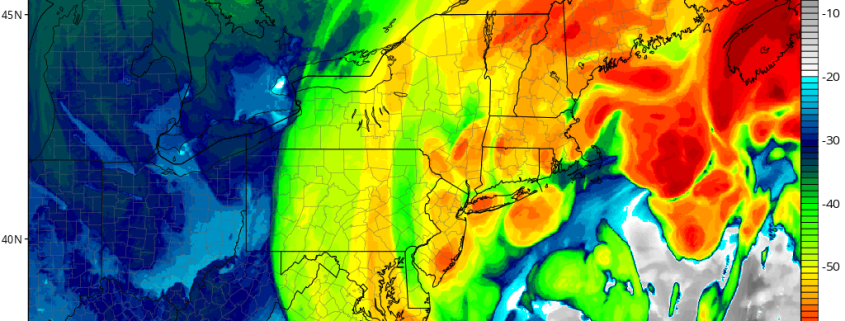 Gradually making our way to the main system, today has been a rather calm, but cold day across the entire east coast as the area remains in a northerly flow coming in from Atlantic Canada. This is partly due in part to the large area of low pressure that impacted the east this past weekend with heavy rains, hurricane-force winds, and over 40″ of snow in some locations. After the moved off the coast, it was blocked from moving North and into the North Atlantic due to record-high blocking near Greenland. Regardless, this massive system has still had a large impact on our weather for the past three to four days now, but that will soon come to an end. Mid level ridging will increase just enough for a strong area of high pressure to attempt to build in over the Northeast this evening, allowing for calm and cold conditions to persist throughout the evening hours. Very dry mid to upper levels of the atmosphere in-between disturbances will ensure that clouds are kept at a minimum, and with clear skies and relatively light winds, we should see rather favorable conditions for radiational cooling to take place. This should allow lows this evening to drop into the middle to upper 20’s, with some locations off to the north and west  seeing readings drop down into the lower 20’s.