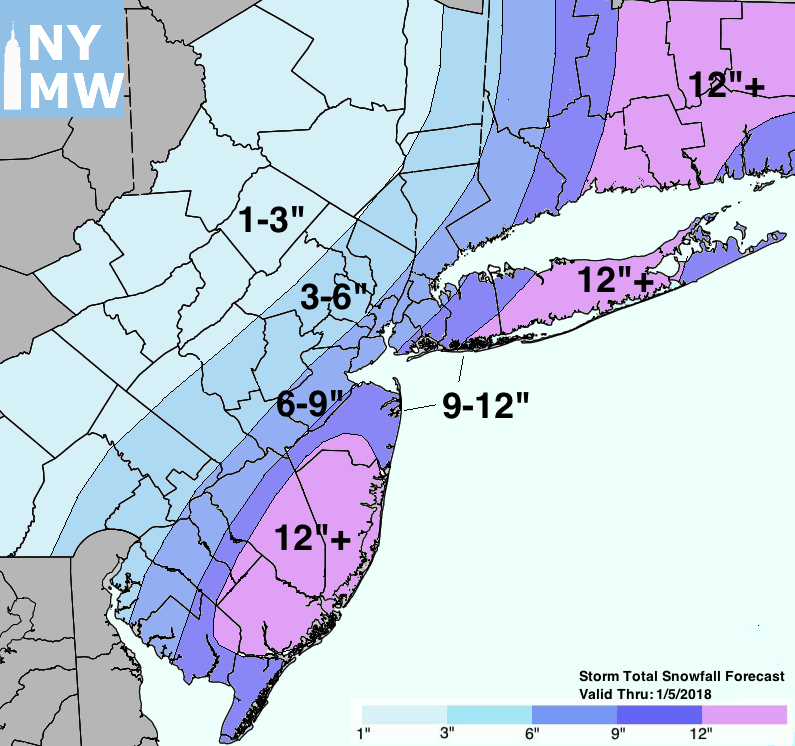 Overall, we expect the heaviest snowfall to occur from SW to NE over SE PA, Central/Northern NJ, Southern NY, and possibly into portions of Connecticut. While this system will be moving quite quickly, the heaviest snows look to happen during the afternoon/early evening hours, with the evening commute possibly being heavily impacted. Snowfall rates may be too intense in some locations for road crews to keep up with, so please begin to come up with alternate plans if you will be traveling during the day on Wednesday. Otherwise, snow will begin to taper off during the early evening hours from south to north, with conditions clearing out by the overnight hours of Thursday. Accumulations should generally top off in the 9-12″ range, however there are some indications that locally higher amounts of up to 12-18″ could be possibly in the most intense banding. We will have another update tomorrow morning to address any changes that occurred overnight.