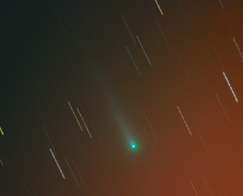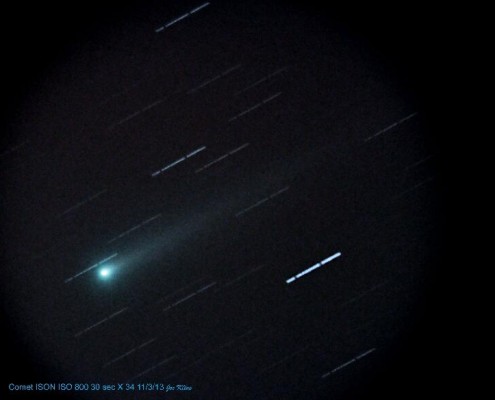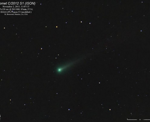 Comet ISON (C/2012 S1) was discovered by V. Nevski and A. Novichonok on September 21 2012. The name ISON comes from “International Scientific Optical Network” which is the name of the observatory used to make the discovery. ISON will reach perihelion on November 28 2013 and current brightness estimations suggest that it will be visible to naked eye, binocular and telescope viewers. Additionally, the path of the comet will place it inĀ a very favorable position for observation. (Courtesy TheSkyLive)