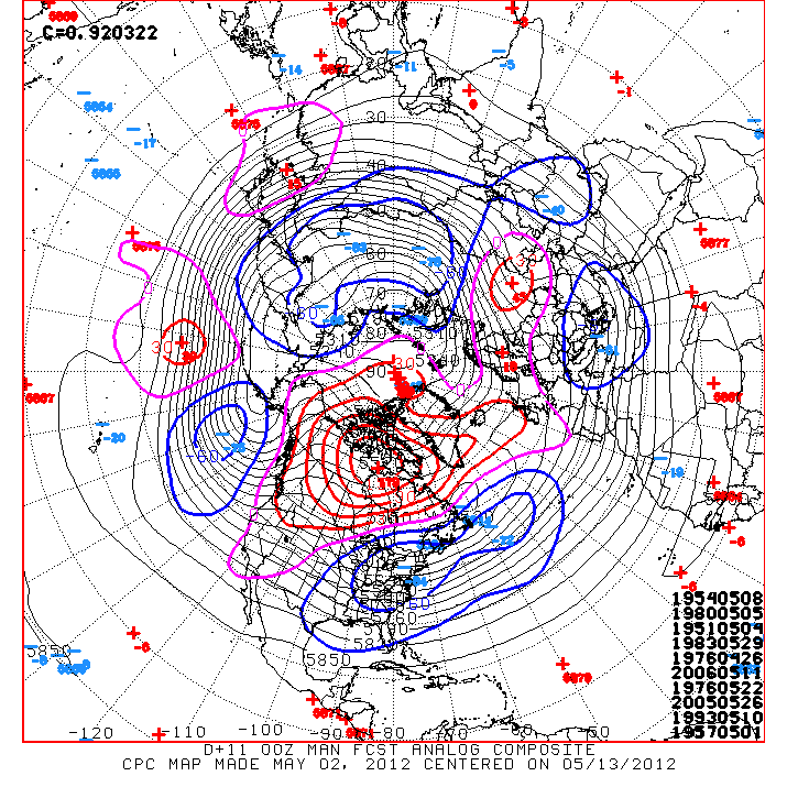 The MJO is forecast to spiral towards Phase 8 by the second week of May by the GFS and ECMWF forecasting schemes. Such an occurrence, albeit modeled as weak and near the COD, supports above normal temperature anomalies in the Northeast and Eastern United States historically. The presence of the Southeast ridge seems fairly strong on these historical analogs as well.