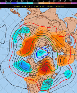 May 2012 has started with a bit of an up and down feel. The first day began chilly and cold — but ended with temperatures soaring into the 70’s by late afternoon after a warm front passed. But shortly thereafter, a backdoor cold front moved through and kept May 2nd cool, dreary, and well below normal. Such will be the trend over the first two weeks of April. The main culprit will be high latitude blocking which is forecast by most global ensembles to develop by around the first weekend of May. The advertised blocking over Greenland and the Davis Straight hasn’t been a staple in the pattern since last May (not surprisingly, we had a period of below-normal departures then as well).
